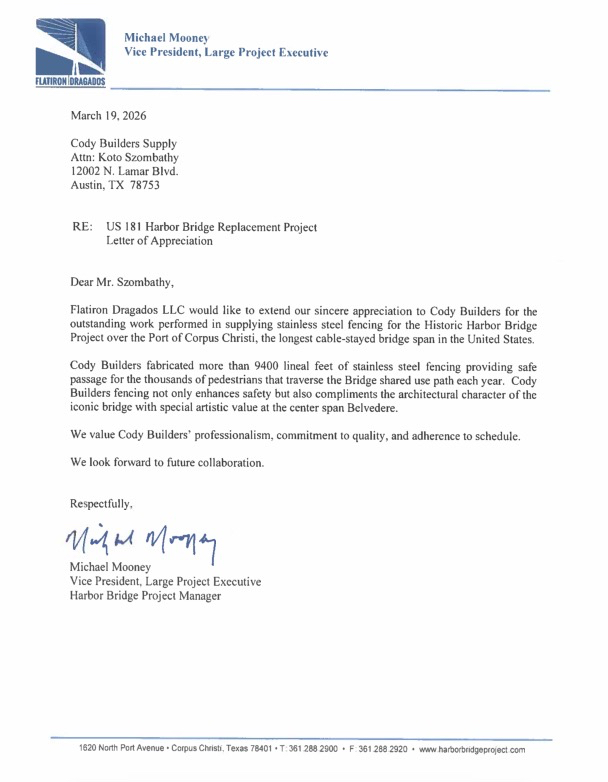 This is the most divine of projects to have participated in. The sheer size and extent of this engineering marvel are difficult to grasp. The mutual action and cooperation of so many men who created such a thing. It was an honor to be a part of it. If you run from one end of the bridge to the other, you jog past our stainless steel fence, which will be there for our ancestors, to keep them from falling off. It’s hard to imagine that all that fence came out of our Lamar shop. Massive ships now pass by under the new bridge, which would not have cleared the old one, and in the middle, you can look through the binoculars and see the crews directing the vessels through the channel. Click on our “Concepts to Reality” page for some work we did to dial in some design elements of this fence. Because our customer, Nick Manfrendini, asked us to look at some metal expansion joints, we began making them and have completed several fabrications of such across the nation. We’re proud to be Bridge Builders!