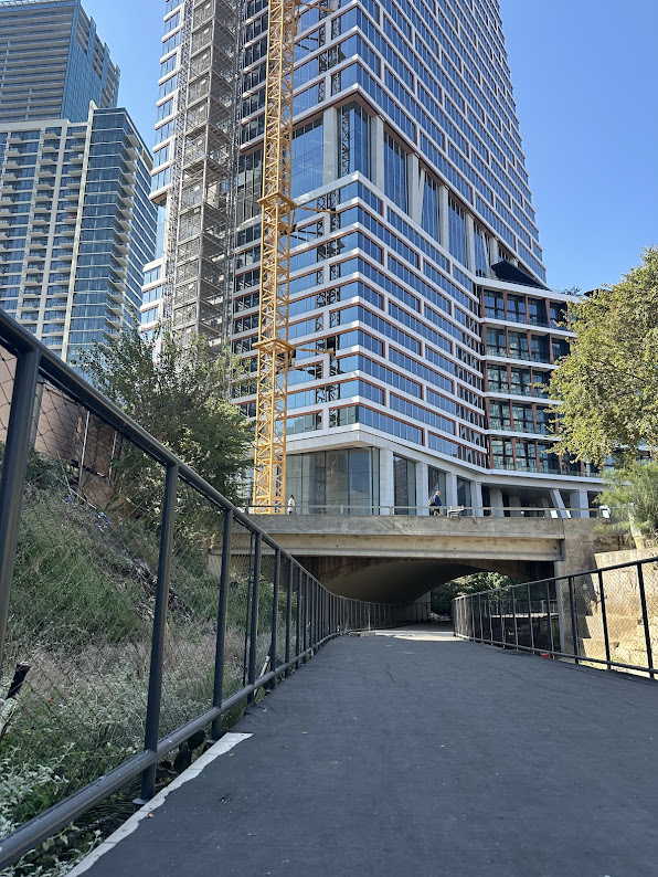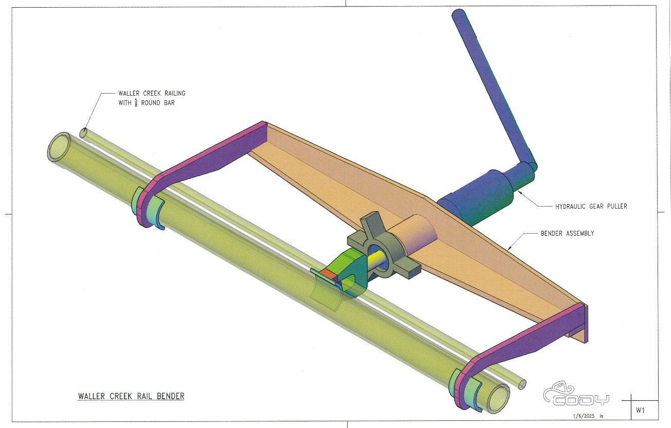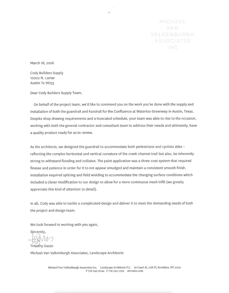 The job involved twisty, curvy paths through downtown Austin. A special straightening tool had to be devised to ensure smooth alignment in the field work. We did both the furnishing and the installation for this high-profile job. The paint system was particularly tricky and expensive. Thanks to our partners and Tim Gazzo at Michael Van Valkenburgh Associates, who designed such a masterful symphony of metal with nature. Thanks to Carl Stahl and Carlos Biera for supplying the cutting-edge stainless steel mesh system that we wove onto the railing.